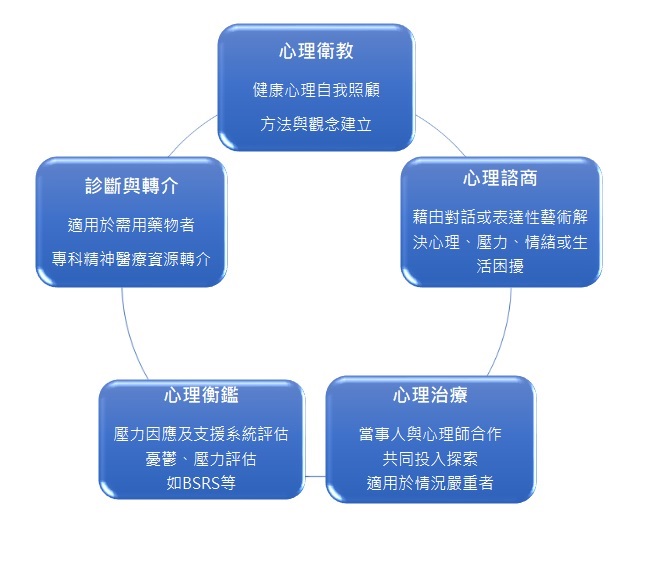 在疾病治療期間,若能有適切的心理專業介入,給予關心與承接病患或其親友之壓力、情緒衝擊(如悲傷、憂鬱、焦慮、煩躁)、生活失序、疾病適應(如失能、慢性疼痛),以及照顧疲憊、經濟消耗、醫療決策等心理社會反應與困境,對於患者疾病進展適應、壓力調適、癒後支援系統的穩固,以及其家屬的心靈安頓能有相當助益。